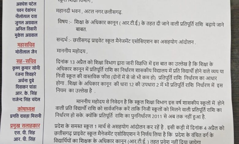 रायपुर। प्रदेश के समस्त स्कूल 1 मार्च से असहयोग आंदोलन कर रहें है . इसी कड़ी में दिनांक 4 अप्रैल को छत्तीसगढ़ प्राइवेट स्कूल मैनेजमेंट एसोसिएशन ने निर्णय लिया था कि स्कूल शिक्षा विभाग द्वारा लाटरी के माध्यम से आबंटित वंचित वर्ग के विद्यार्थियों को शिक्षक के अधिकार कानून (आर.टी.ई. ) तहत प्रवेश नहीं दिया जायेगा .