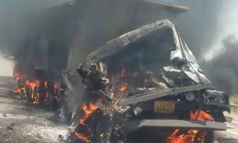 टक्कर के बाद ट्राला में लगी भीषण आग